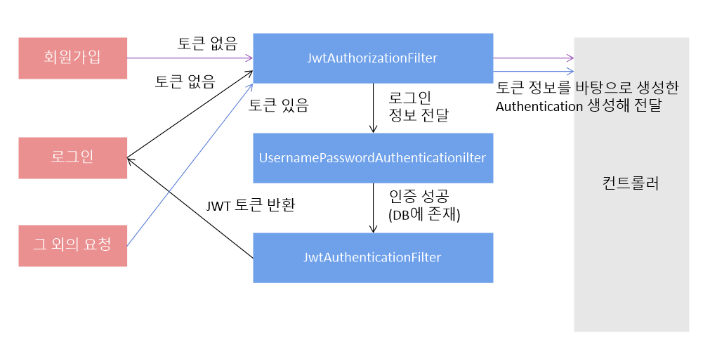 - WebSecurityConfig에서 HttpSecurity의 addFilterBefore 메소드를 통해 위와 같이 필터를 등록해준다.