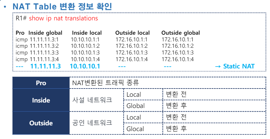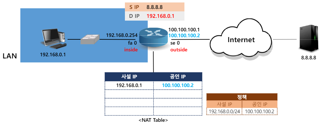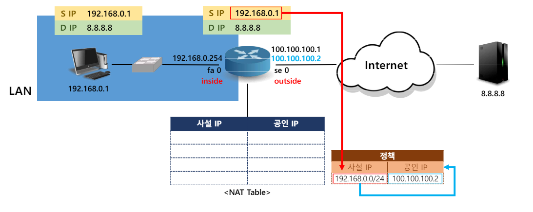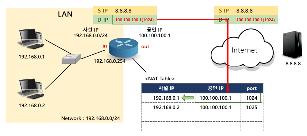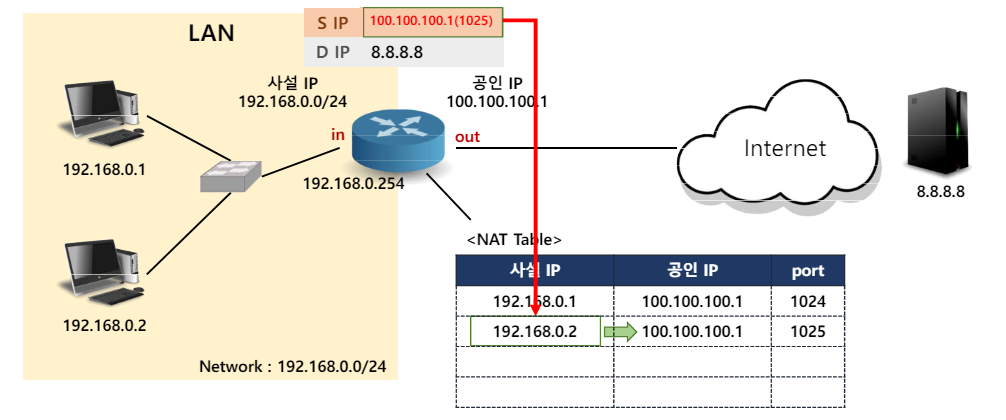 - intranet에서 공용 네트워크에 접근하기 위해 네트워크를 연결하는 Router에서 사설 IP를 공인 IP로 변환시켜 내보냄